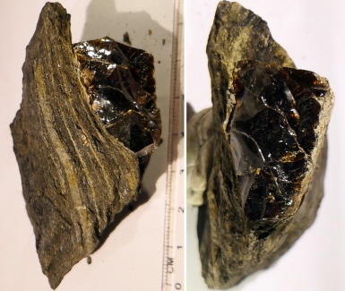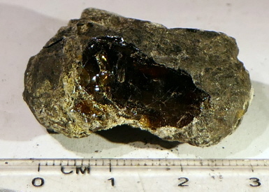 Ein 80 mm großes Matrixgestein enthält einen Bernstein von 28 mm Größe. Eigenfund aus der Nähe von Plaffein/Plasselb. Alter: Palaeozän-Tertiär, also über 55 Millionen Jahre alt.