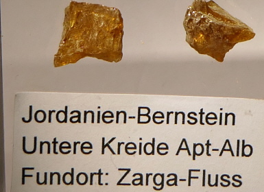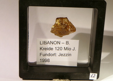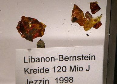 Libanon-Bernstein: gefunden im Südlibanon nahe Djezin. Alter: Unterkreide (um 130 Mill. J.), überwiegend auf primärer Lagerstätte. Aufgrund des Alters und des reichen Insektenvorkommens ist libanesischer Bernstein von besonderem paläontologischem Wert. Leider ist die Fundstelle seit vielen Jahren wegen der Unruhen nicht mehr zugänglich.