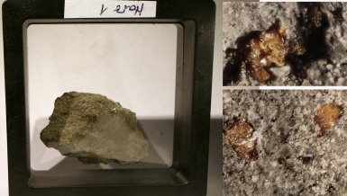 Zwei Matrixgesteine von 37 und 20mm enthalten Bernsteine von 6 und 8 mm Größe. Eigenfund aus der Nähe von Plaffein/Plasselb. Alter: Palaeozän-Tertiär, also über 55 Millionen Jahre alt.