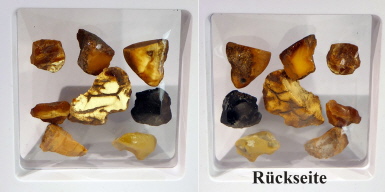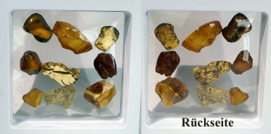 8 kleine Bitterfelder Bernsteine zeigen die verschiedensten Farbvarianten von weiß über gelblich, braun, grau bis fast schwarz. Der größte ist 25mm. Es sind Eigenfunde aus dem Jahr 1994. Bilder von der Fundsituation damals in den Braunkohlegruben der 90er Jahre und die Situation heute maile ich gerne als digitale Bilder.