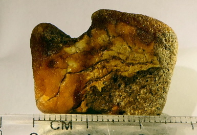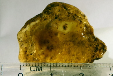 Diesen Bernsteinfund habe ich 1994 in der legendären Bitterfelder Braunkohlegrube gemacht. Der Bernstein ist milchig-gelbbraun mit weißlichen Schlieren, wiegt 6g und ist 36mm groß.