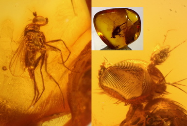 In einem 10 mm Baltischen Naturbernstein liegt eine perfekt erhaltene Langbeinfliege DOLICHOPODIDAE. Schaut euch das tolle Fazettenauge an, jedes Einzelauge gestochen scharf zu erkennen.