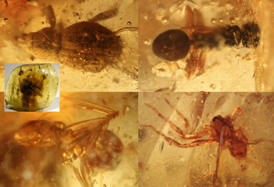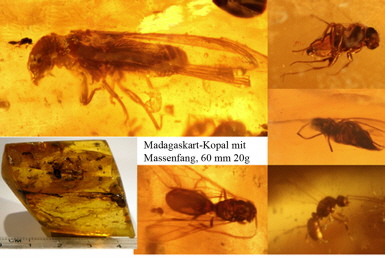 In einem 60 mm (!) großen und 20 g (!) schweren Madagaskar-Kopal liegt ein Massenfang, bestehend aus einer geflügelten Termite ISOPTERA, 4 geflügelten Ameisen FORMICIDAE, einer Wespe HYMENOPTERA und mehr.