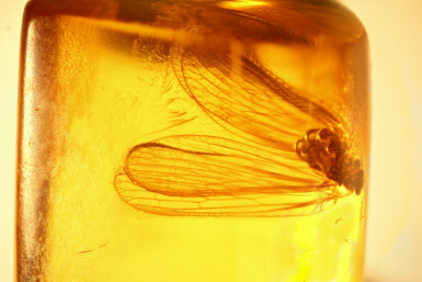 Eher selten in Bernstein zu finden: eine Kriebelmücke SIMULIIDAE in einem 14 mm klarhoniggelben Baltischen Naturbernstein.