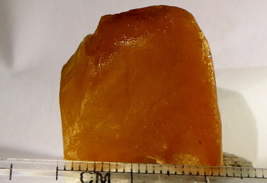 Dieser roh belassene 26-Grammer ist 48 mm groß. Beim Schleifen wird sich daraus ein Prachtbernstein entwickeln. An einer Stelle kann man das Innenleben erkennen: Schöner braungelber fester Bernstein.