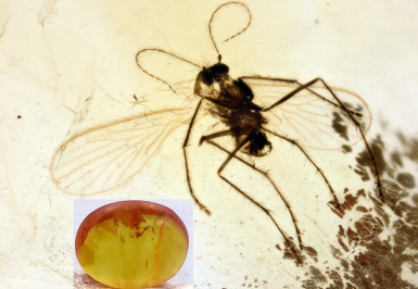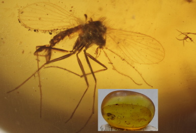 In einem 21 mm Burmesischen Bernstein liegt diese sehr gut erhaltene Pilzmücke. Es gab die Schrecken der Pilzsammler also auch schon vor 100 Millionen Jahren. Sie legen ihre Eier in Pilzfruchtkörper und machen ihn "madig".