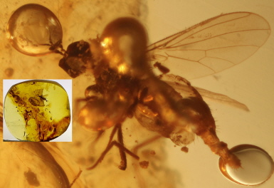 In einem 17 mm Burmesischen Bernstein liegt ein Doppelfang, bestehend aus einer Dungmücke SCATOPSIDAE und einer seltenen Mücke NEMATOCERA. Außerdem sind Pflanzenreste enthalten.