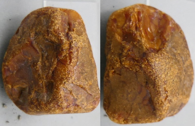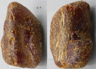 Diesen Bernstein habe ich Ende der 90er Jahre in der Kiesgrube Zarrenthin gefunden. Er wiegt 5 g und ist 31 mm groß. Er zeigt die typische Verwitterungskruste von Bernstein, der eine zeitlang mit Luft in Kontakt gekommen ist. Innen ist er fest und unversehrt.