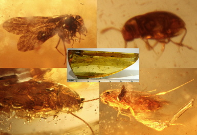 In einem 65 mm (!) großen und 11 g (!) schweren Madagaskar-Kopal liegt ein Massenfang, bestehend aus einer großen Schabe BLATTOIDEA, einer Zuckmücke CHIRONOMIDAE, einer Trauermücke SCIARIDAE, einem großen Bein, Rindenlaus PSOCOPTERA, Kleinschmetterling MIKROLEPIDOPTERA, einer Fliege und einem Käfer COLEOPTERA.
