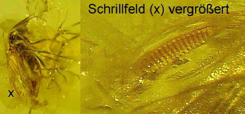 Der Gesang der Zikaden (auch bei Kleinzikaden ist der Gesang mittlerweile nachgewiesen) funktioniert ganz anders und die körperlichen Voraussetzungen sind wahrscheinlich im Bernstein nicht zu erkennen. Denn die Lautorgane (Trommelorgane, Tympanalorgane) funktionieren so: