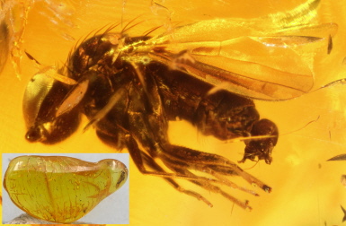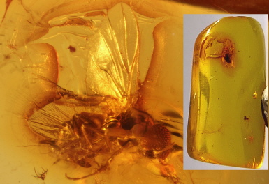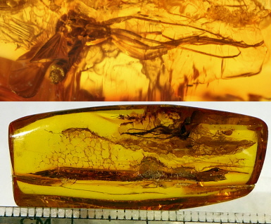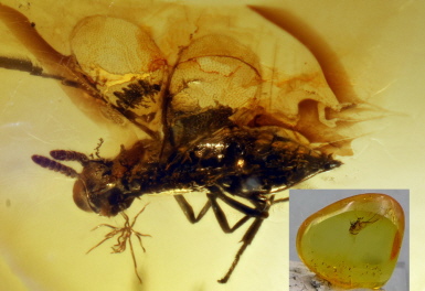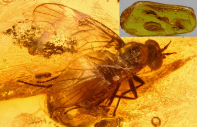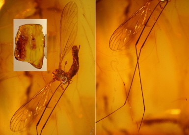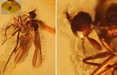 In einem 15 mm Baltischen Naturbernstein liegt ein bestens erhaltenes Langbeinfliegen-Männchen, zu erkennen und ein deutig zu bestimmen an dem filigran gebauten Geschlechtsorgan. Es die Familie DOLICHOPODIDAE und artbestimmt als PALAEOMEDETERUS IGNAVUS (MEUNIER).