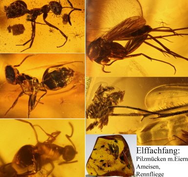 Riesen-Pilzmücke MYCETOPHILIDAE mit einem großen Eipaket, 5 (!!) weiteren Pilzmücken, 4 Ameisen FORMICIDAE und einer Rennfliege PHORIDAE. AUSNAHMESAMMLERSTÜCK VOM FEINSTEN!