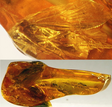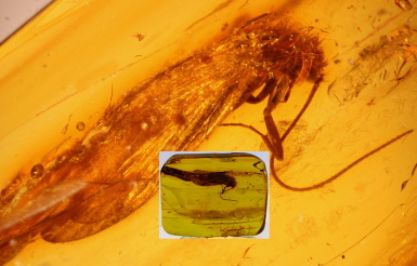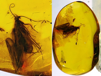 In einem 18 mm klarhoniggelben Baltischen Naturbernstein liegen zwei Haarflügler = Köcherfliegen TRICHOPTERA dicht beieinander, die Hinterleibsenden zueinander zeigend. Deshalb stellt sich die Frage, ob dieses eine Stellung zum Geschlechtsakt ist (post copula?).