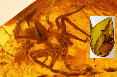 In einem 17 mm klar-honiggelben Baltischen Naturbernstein liegt ein WEeberknecht OPILIONES und viele Sternhaare der Eiche.