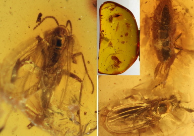 In einem wunderschönen 25 mm Baltischen Naturbernstein liegt ein Dreifachfang, bestehend aus einem seltenen kleinen Käfer aus der Familie ARTEMATOPODIDAE, eine Tanzfliege EMPIDIDAE und einer Trauermücke SCIARIDAE.