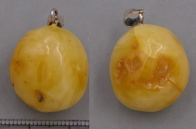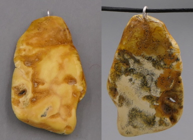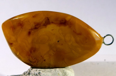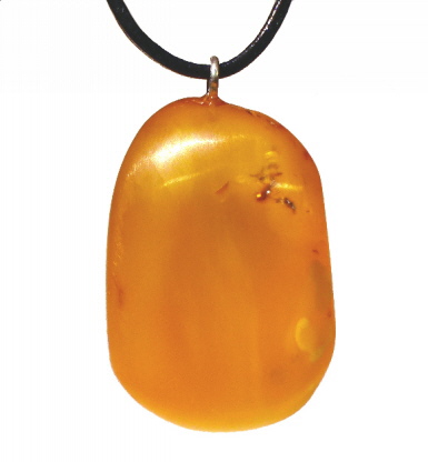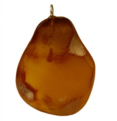 Eine 23 mm milchig-gelbe Farbvariante vom Baltischen Bernstein, durch "Patina" nachgedunkelt. Mit Öse und Schlaufe. Lederband wird kostenlos mitgeliefert.