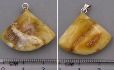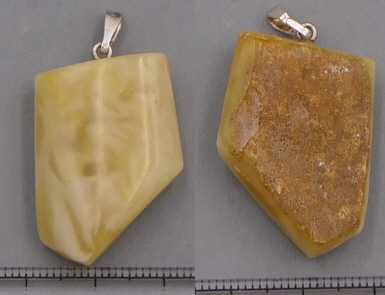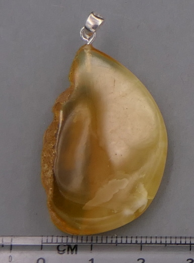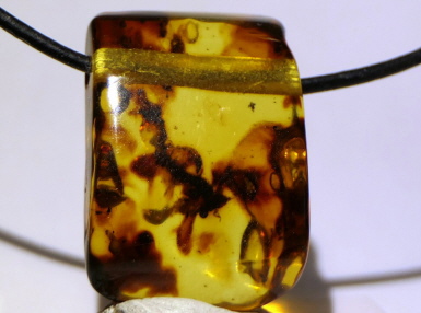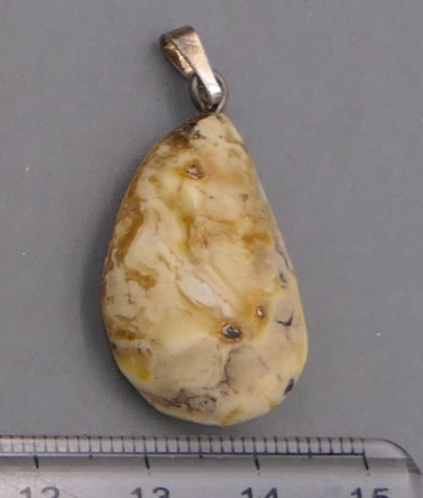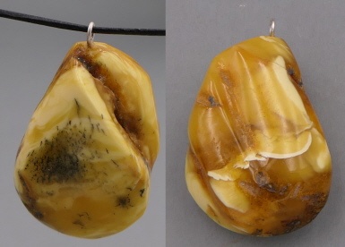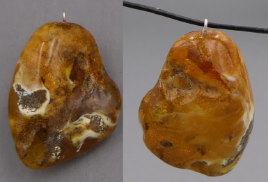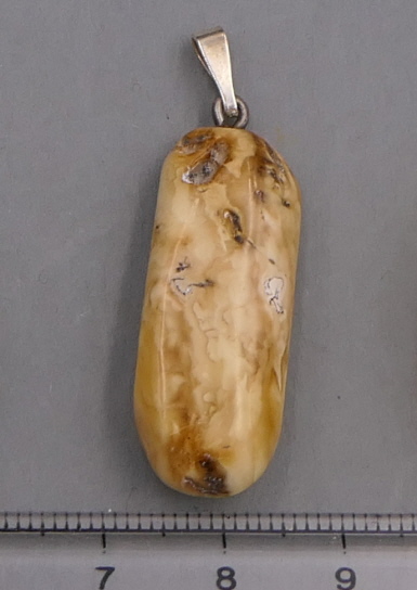 Ein 31mm großer und 3,5g schwerer wunderschöner Baltischer Naturbernstein mit klaren, weißlichen und gelb-milchigen Anteilen. Mit Silberöse. Dünnes Lederband wird mitgeliefert.