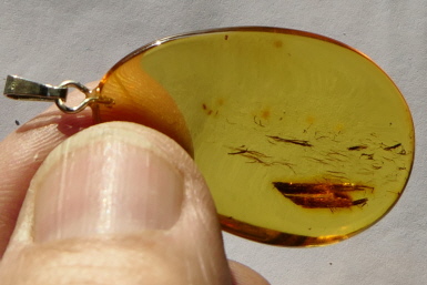 Ein Mexikanischer Bernstein aus der Grube Simojovel (Chiapas) in einem Netz aus Silberfäden gefangen. Unten ist eine Silberfeder hängend, typisch, wie sie die Mayas aus Gold fertigten.