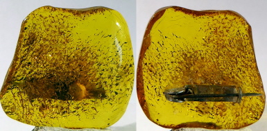 Ein 4g schwerer, 35mm großer Baltischer Naturbernstein, klar. Hinten ist eine Broschnadel angebracht.